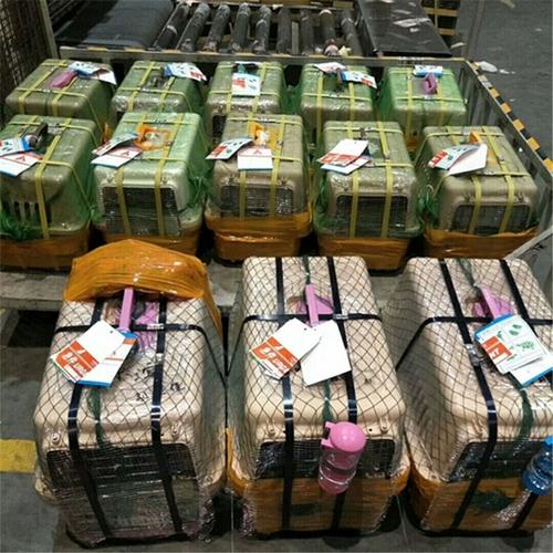 注:籠箱。航空公司都要求小型寵物(體重小于15公斤)要用專用的寵物航空箱,開口需要鐵絲扎緊,并打井字形包裝帶。 中、大型寵物(體重大于15公斤)要用木制航空箱內(nèi)襯鐵絲網(wǎng)并要求結(jié)實可靠。